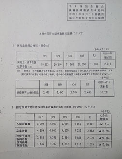 執行部からの資料説明は割愛させていただきますが、見ておわかりになるように、1の保育士数等の推移では、下段の保育士の4年間の新規登録者数の累計は10,225人である一方、保育所等で働く保育士・保育教諭は5か年で2,914人の増であり、約7,000人の差が生じています。